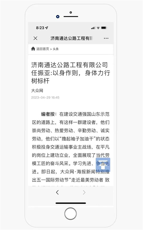 不畏艰险,逆流而上。今年,面对G309青兰线济南淄博界至章丘胡山大街段改建工程施工任务,他主动请缨,担任项目总工一职。吃苦在前、冲锋在前,难事急事他先上,不断在施工中总结、创新施工理念,注重将新技术、新方法应用到施工一线。他时刻在工作中发挥模范带头作用,带动身边同事发扬吃苦耐劳、开拓进取、甘愿奉献的优良传统,充分起到了榜样引领作用。